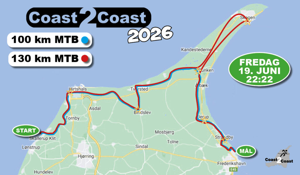 100 km MTB…. Med start fra Skallerup kl 22:22 kører de 2 MTB ruter mod nord og inden om Hirtshals hvor der selvfølgelig venter et lækkert depot med fiskefrikadeller og en skarp til halsen at varme sig på. Herefter mod Bindslev og det glade juledepot. Så videre mod Bunken..