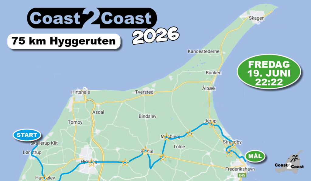 Ruten der oser af fest og farver, masser af lys og højt humør fra start i Skallerup kl 22:22 til mål på Palmestranden. 75´eren går over Hundelev og Hjørring syd, videre mod Sindal over Mosbjerg, Jerup, Strandby og Elling, inden de rammer Palmestranden ved Frederikshavn.